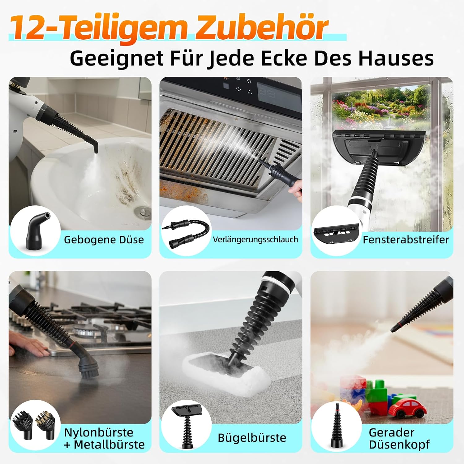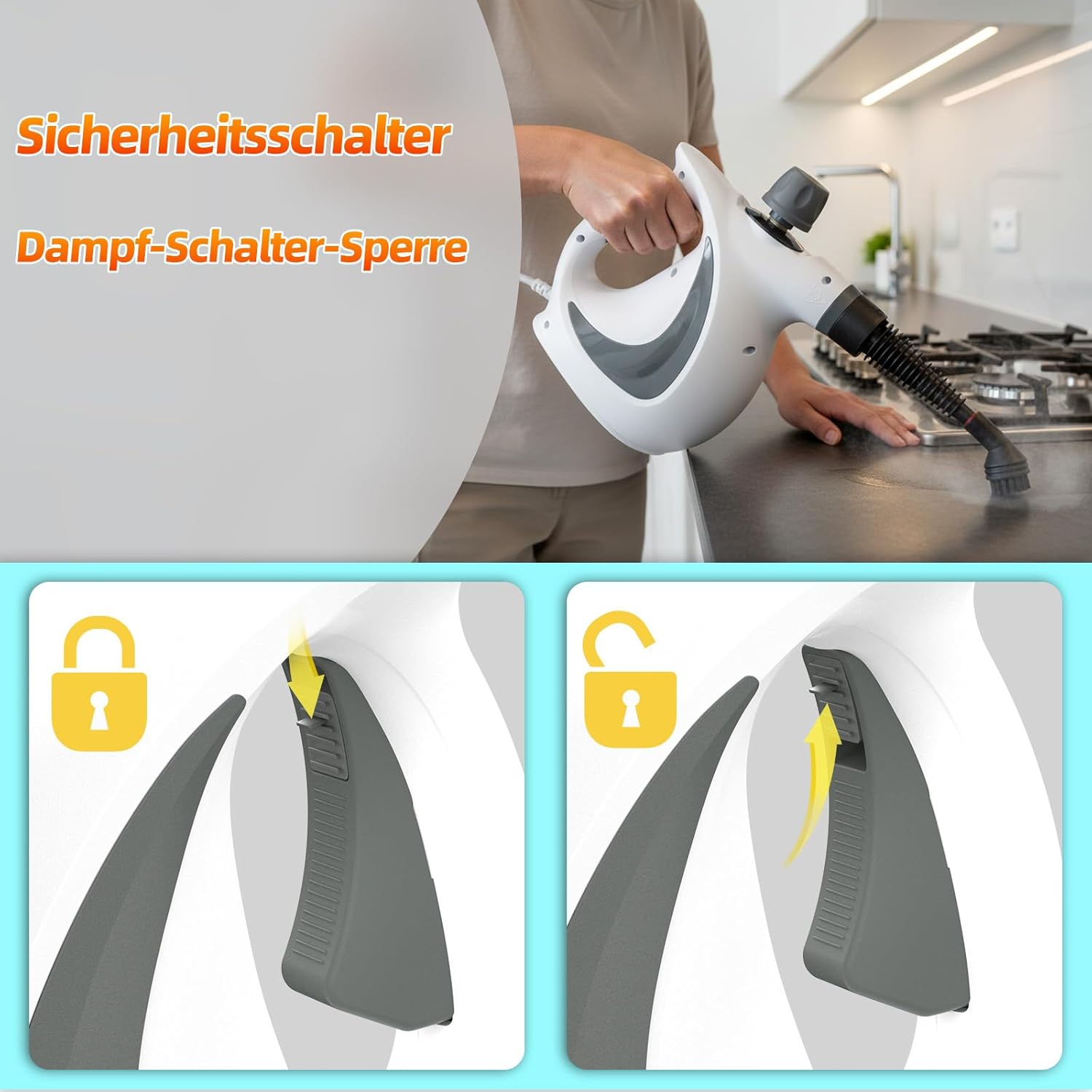 Der Dampfreiniger erreicht schnell eine hohe Temperatur und löst selbst hartnäckigen Schmutz. Fett, Kalk und Ablagerungen lassen sich ohne großen Kraftaufwand entfernen. Ideal für Küche, Bad und andere stark beanspruchte Bereiche.